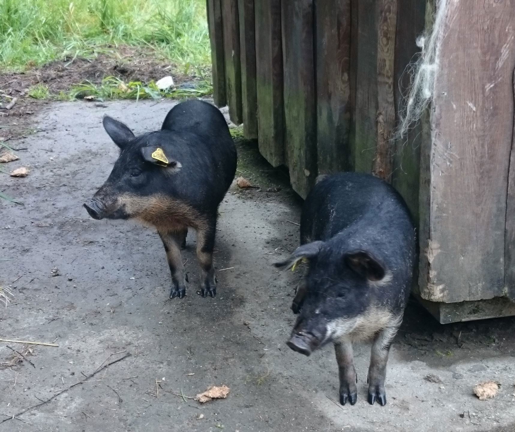Heldiggrisen Babe og Svartepetter ble navnene på grisene og det ser allerede ut som om de trives godt i grisebingen vår. Ullgris er en rase vi ikke har hatt før og disse vokser mye senere enn de grisene vi har hatt tidligere. De er klar for slakting etter ca 18 måneder, og det betyr at vi har god tid til å bli kjent med grisene. De har også et godt lynne som betyr barna kan være med inn til de under stell og mating, og de kan mates fra hånden og klappes mens de spiser. Griser spiser nesten det samme som oss mennesker og for tiden får de mye brød og epler. Grisene er renslige og holder det rent inne i huset sitt og går på do ute. Vi gleder oss til å bli godt kjent med Heldiggrisen Babe og Svartepetter :-)