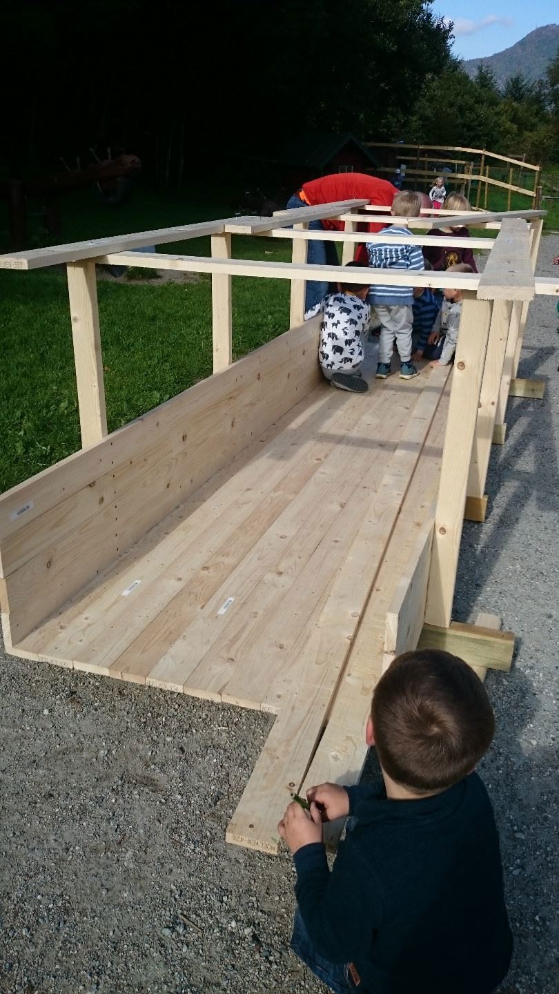 Det viste seg fort at revefeller overaskende store tatt størrelsen på reven i betrakning, men vi har fulgt tegningene og nå er endelig revefella ferdig. Barna har selvfølgelig vært med på byggingen og har både sagd og skrudd fast plankene. Til slutt har vi testet ut fellen og den fungerer iverfall på små jenter og gutter.