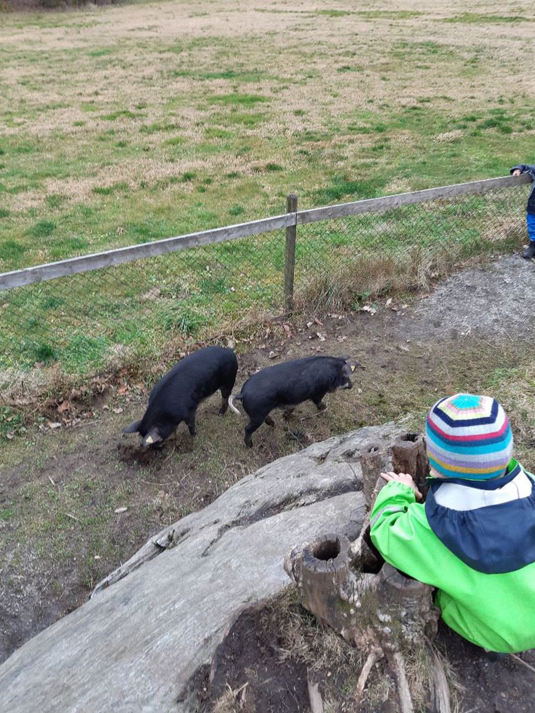 Av og til får grisene komme på besøk til oss på lekeplassen, det synes både barn og griser er kjempegøy. De hjelper oss og grave i sandkassen og i blautaskiten. Løpe etter de er og gøy !! Perfekt måtte og bli vant til dyr og kose litt med de