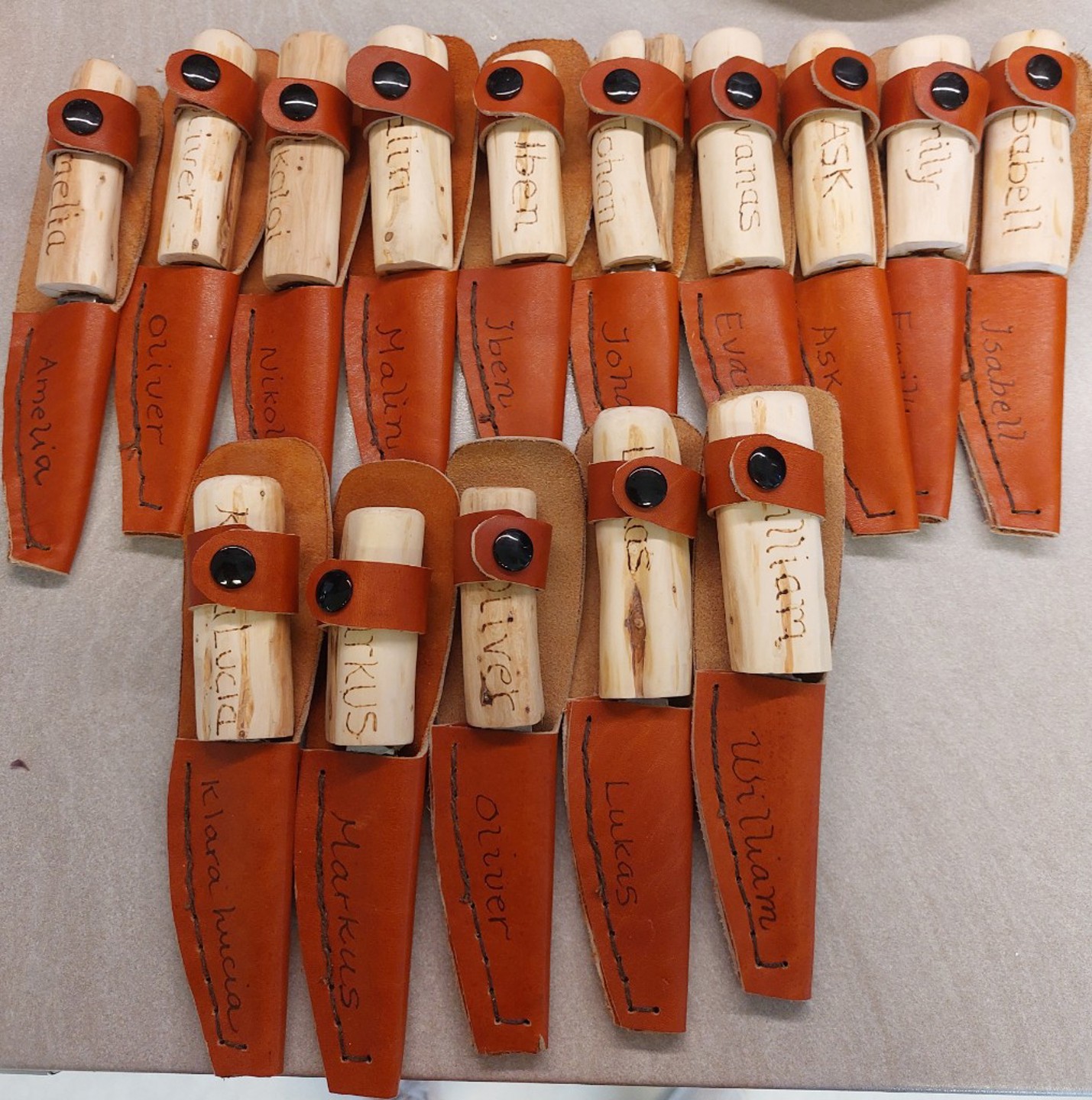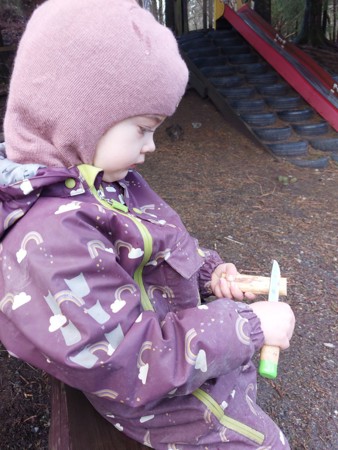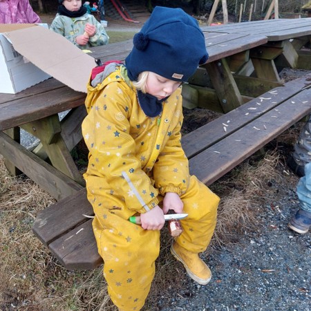 Det siste året før de eldste begynner på skolen har vi en prosjekt som går over hele året, nemlig kvinlaging. Om høsten finner vi emner til skafte , og begynner så smått å spikke og pusse slik at vi får oss et ordentlig fint skaft. Etterhvert blir det funnet frem skinn som skal syes av hvert enkelt barn i samarbeid med voksne. Og tillslutt , når vi nærmer oss slutten av barnehageåret har alle fått laget seg en skikkelig fin kniv....perfekt for spikking av grillpinner :-)